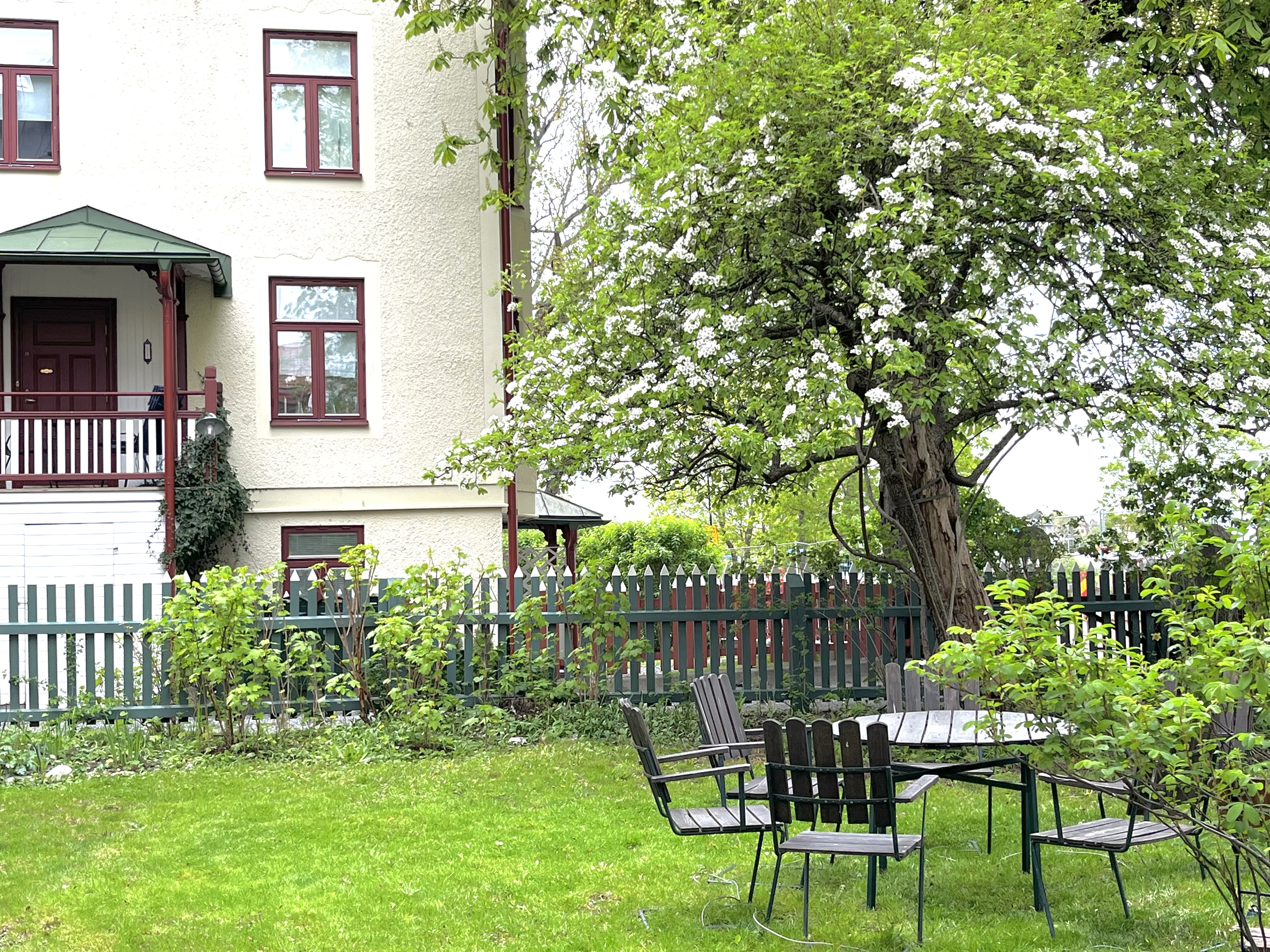 (You find the english text above!) Vår sekelskifteslägenhet, med fönster i fyra väderstreck, ligger i marknivå inbäddad i trädgårdens grönska. Från hallen som är välkomnande och rymlig kommer du vidare in i köket med öppen planlösning mot vardagsrummet och glasverandan. Det stora sovrummet har dubbelsäng och rymliga garderober. I arbetsrummet finns en bred extrabädd, en futon. I vardagsrummet och i arbetsrummet finns fungerande kakelugnar. Hallen och det sköna badrummet med morgonsol har golvvärme. Från glasverandan har vi utsikt över Mälaren och ett stenkast från huset finns en badplats med stor solbrygga och badstegar. Under sommarhalvåret liknar vår lilla gata närmast en badort, med människor som strosar i badrock ner för berget för att ta sig ett morgon eller kvällsdopp. I trädgården finns flera sittgrupper som delas med de andra som bor i huset. Här finns också den fullt utrustade tvättstugan. Till lägenheten hör en egen parkeringplats på gården. ENG: Our turn of the century apartment, with windows in all four directions, is on the ground floor embedded by greenery and garden. From the roomy hall you reach the kitchen and, with the open floorplan, you proceed into the living room and a glass porch. The master bedroom has a large double bed and spacious wardrobes. In the study there are more wardrobes and an extra bed, a futon. In the living room and in the study there are traditional tiled stoves. The hall and the bathroom have floor heating. From the glass porch we have a view over the lake Mälaren and a stones throw from the house there is a swimming area with a large jetty from where you can dive into the lake. In summertime our little street reminds you of a seaside resort, with people strolling by in bath robes on their way down the hill for a swim. In the garden there are different spots with outdoor furnitures which you share with the neighbours in the house. You also find a fully equipped laundry here. We have our own parking lot outside the house. Five minutes downhill you find Gröndal´s small town center with grocery store, drugstore, library, flower shop and one of the best bakeries/ cafés in Stockholm. Here you also find busses and a tram that take you to the city of Stockholm in twenty minutes. With a car you reach most destinations and other suburbs in 15 minutes as the big thoroughfare “Essingeleden” passes by Gröndal. There is a big playground area for children in Gröndal center and you can easily reach the popular big park area around Vinterviken with large grass lawns, cafés and small gardens by the sea. You can also take long walks along the waterfront on comfortable wooden bridges - or you can rent a kajak. Nearby there is a steamboat that takes you to the city of Stockholm or to Drottningholms Royal Castle with the magnificent park - and to other exciting destinations around Mälaren.